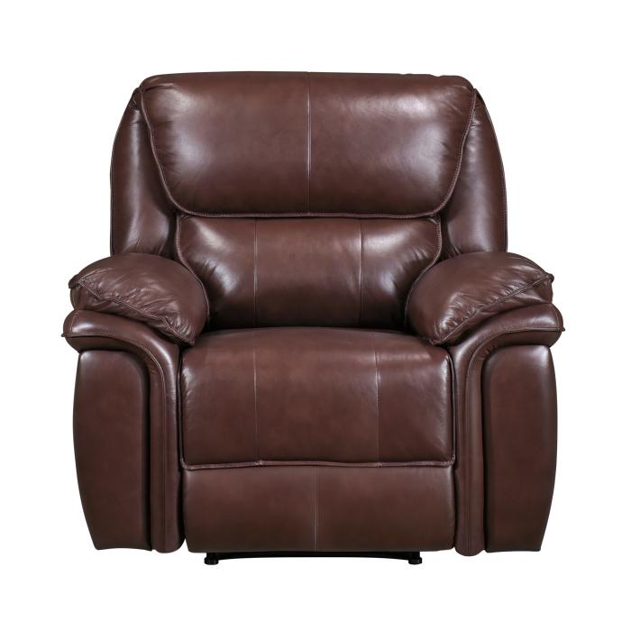 Comfort, style, and motion combine to create the Lyman Collection. The lay-flat reclining mechanism of the chair, allows for complete body extension, perfect for an afternoon nap, movie night, or watching a big game. The transitional frame has hints of modern aesthetic with the chair being covered by 100 percent top grain leather where the body touches, with faux leather covering the remaining areas, its brown hue providing complementing accent to your living room. 42.5 x 38.5 x 41H