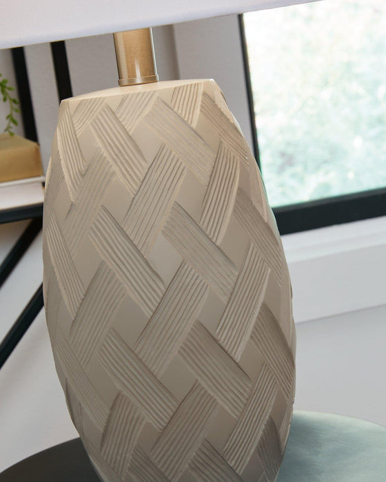 Shine a spotlight on your good taste. With intriguing markings, the Tamner table lamp will be a conversation starter in your living space. Its matte taupe body is topped with a modified drum fabric shade. This unique contemporary lamp will illuminate your decor with style.