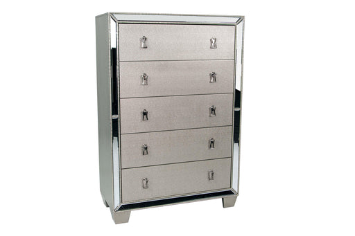 The epitome of fashion-forward design, this chest of drawers is a beautiful blend of style and luxury. Shiny chrome-tone accents, a pearlized finis...