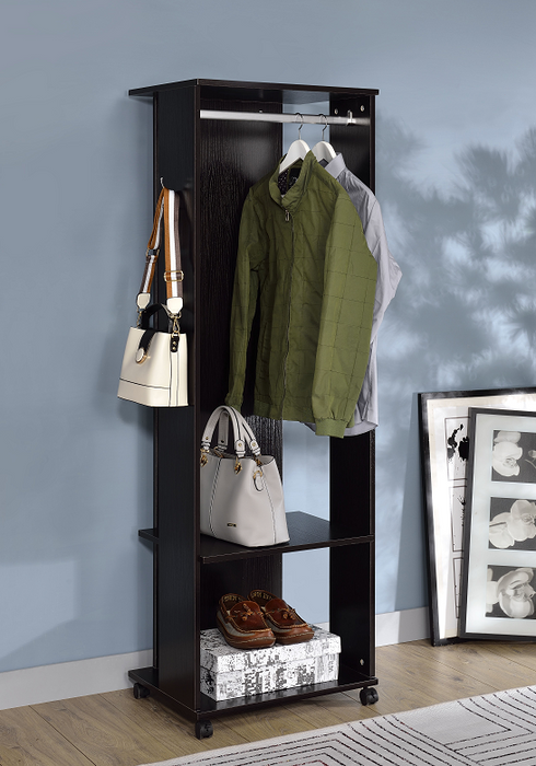 ACME Kolen Hall Tree, Espresso, 21" x 16" x 67"H, 57lbs. Features: - Rectangular Hall Tree - Storage: 2 Open Compartment (Top with Hanging Rod) - Wooden Open Frame and Mirrored Back Panel - Caster Wheels Included Materials: Wood, Veneer, Composite Wood
