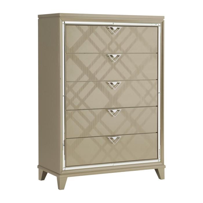 Dramatic from every angle, the Bijou Collection presents as a glamorous statement to the décor of your boudoir. The mirrored framing of the chest provides subtle reflection and distinct accent. The drawers of the chest are fronted with triangle-shaped polished chrome hardware and distinct a distinct geometric pattern.